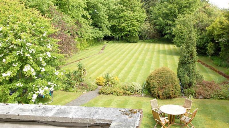 Cavrean has a large front lawn and parking, plus a long back garden including a lawn tennis court and wooded area at the end.
