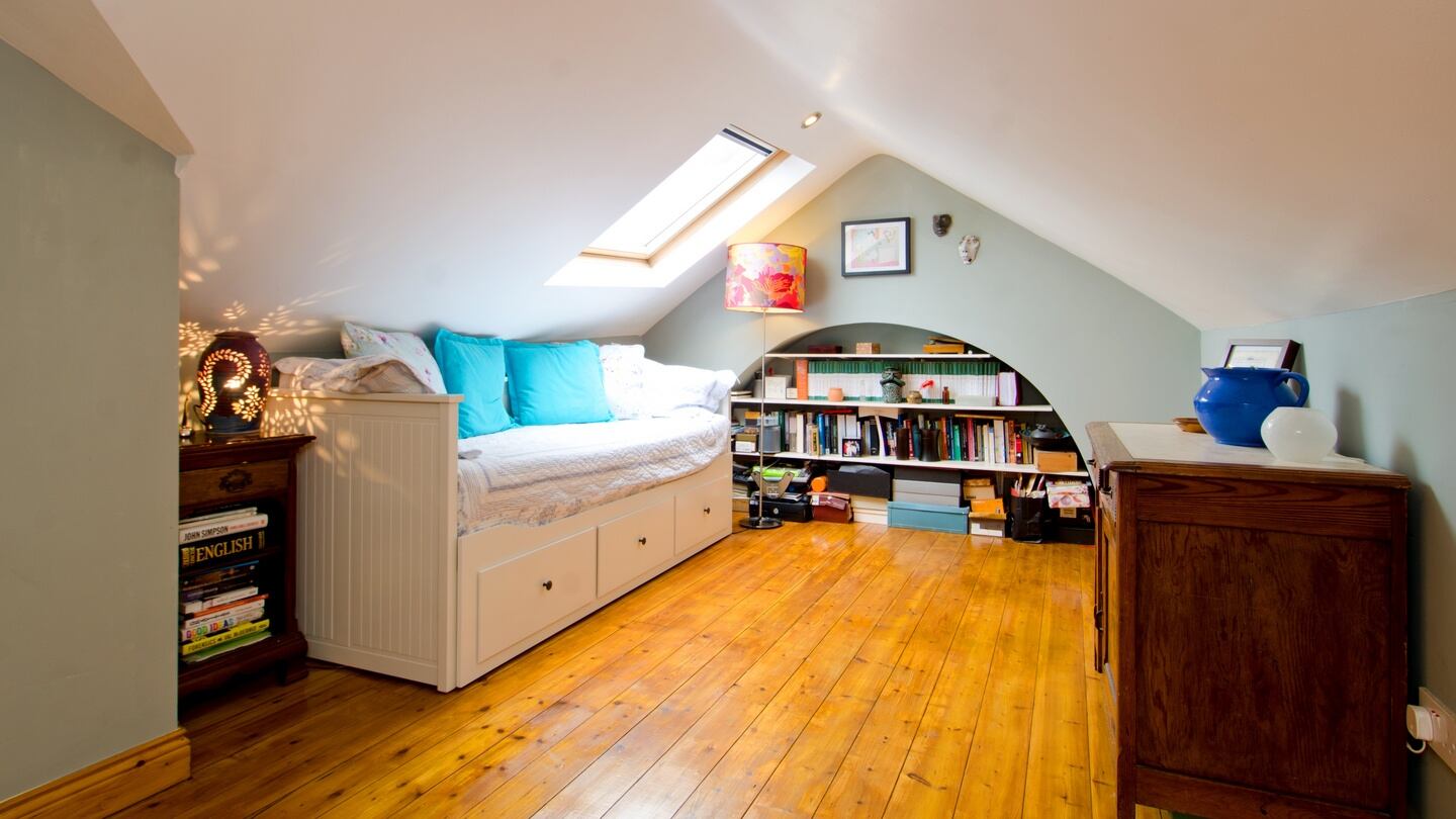 A second bedroom is on a rear return while the attic, good-sized and used as a bedroom, has eaves storage as well as a Velux with chimney pot and tree top views.