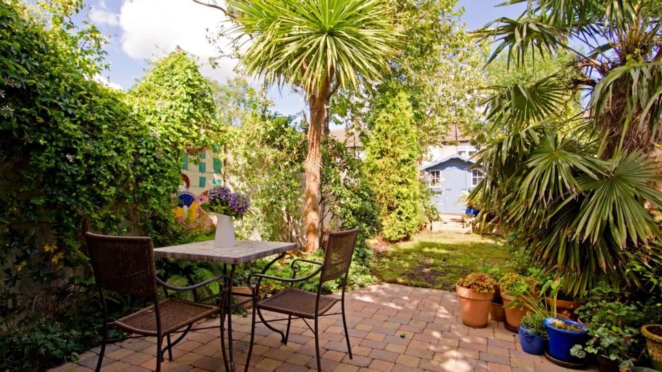 The rear garden has evergreen and plum trees, an impressive rambling passion flower and rose bushes and sheltered sun-trap at the end.