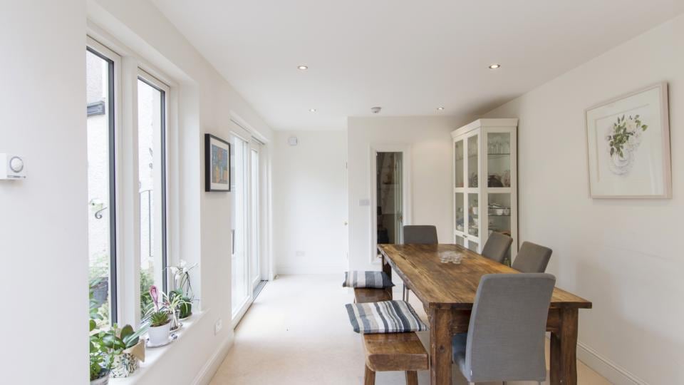The room has walls of glazing on two sides – one has sliding doors out to the good-sized, east-facing garden.