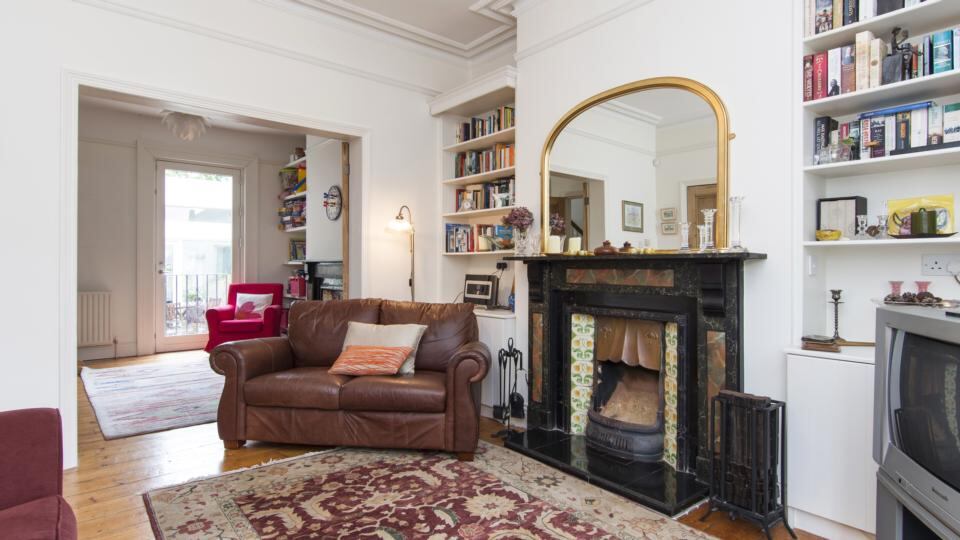 The sittingroom to the front has built-in bookcases in the alcoves. Both rooms have fine period fireplaces with tiled insets, original floorboards, simple coving and picture rails.