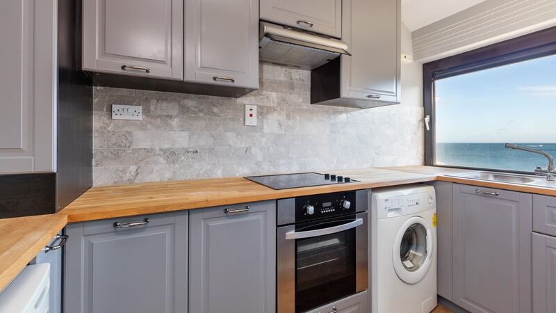 The apartment has been recently refreshed and wears soft coats of restful grey. Off the internal hall the bedroom is to the left and overlooks the road. To the right is the living room. Here there is room to install a decent-sized couch and another chair fireside – this apartment has an open fireplace and its warmth is more than just visual, it’s essential. With a BER rating of G there is no installed heating – its current owners uses the plug-in electric kind and this is something the next owner will want to address.