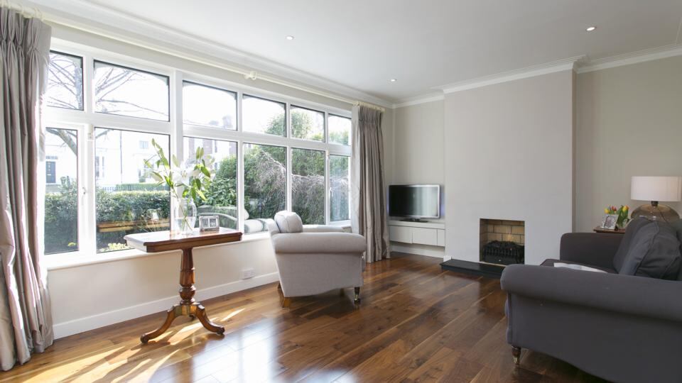 The main house is well appointed with warm solid American walnut floors throughout the ground floor. A formal sitting room the width of the original part of the house is very simply decorated with a gas fire and overlooks the front.