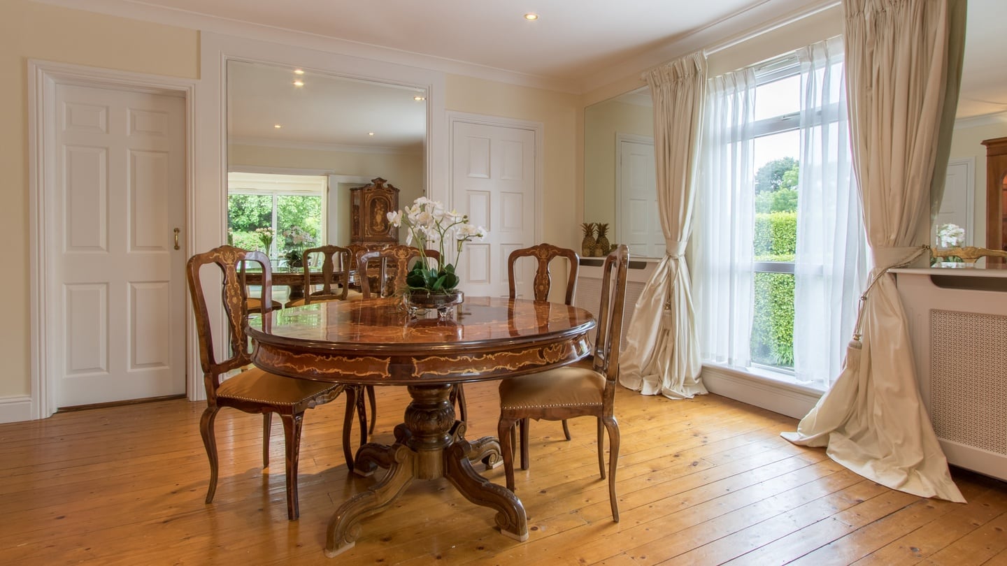 The front door at the side of the house opens into a good-sized entrance hall with a chair and a white-painted cast-iron fireplace. The hall leads from here past the livingroom, diningroom and into the kitchen/breakfastroom which has laminate countertops and laminate tile-effect flooring. It’s a very bright space, with floor-to-ceiling windows looking onto the back garden. A breakfast bar divides the kitchen from the parquet-floored breakfastroom.