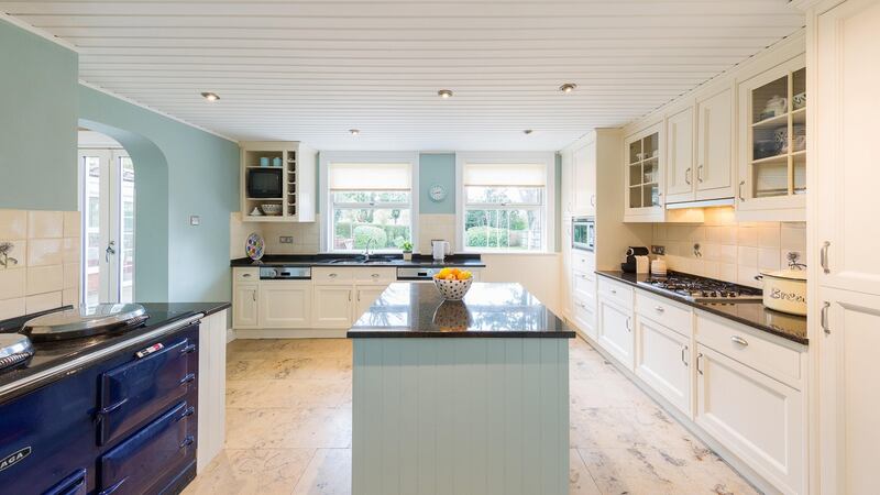 Given the generous floor space of 310 sq m (3,336sq ft), the kitchen seems on the small side. It overlooks the garden, has white-painted units, polished granite countertops and a royal blue two-door Aga, recently converted from gas to electric.