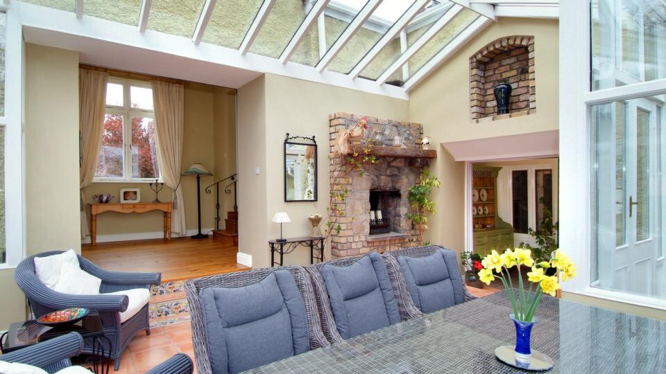 Double doors from the drawingroom lead down a few stairs into a very bright conservatory, with a terracotta-tiled floor and brick fireplace.