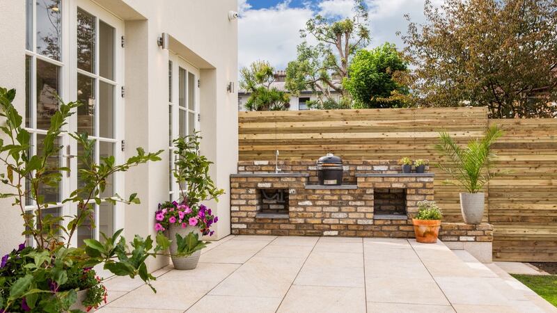 Three sets of timber French windows create a lovely sense of balance to the back wall of this room and open out to a granite terrace over 4m deep that steps down into the garden. While north-west facing the garden is a good size, has been well planted and gets evening sun on the terrace. There’s also a cool brick outdoor kitchen with bespoke concrete counters.