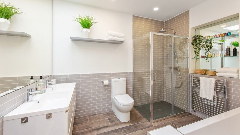 The main bedroom, set to the rear, has a crescent-shaped internal en suite with a large shower stall and smart grey tiling, a look that is mirrored in the family bathroom.