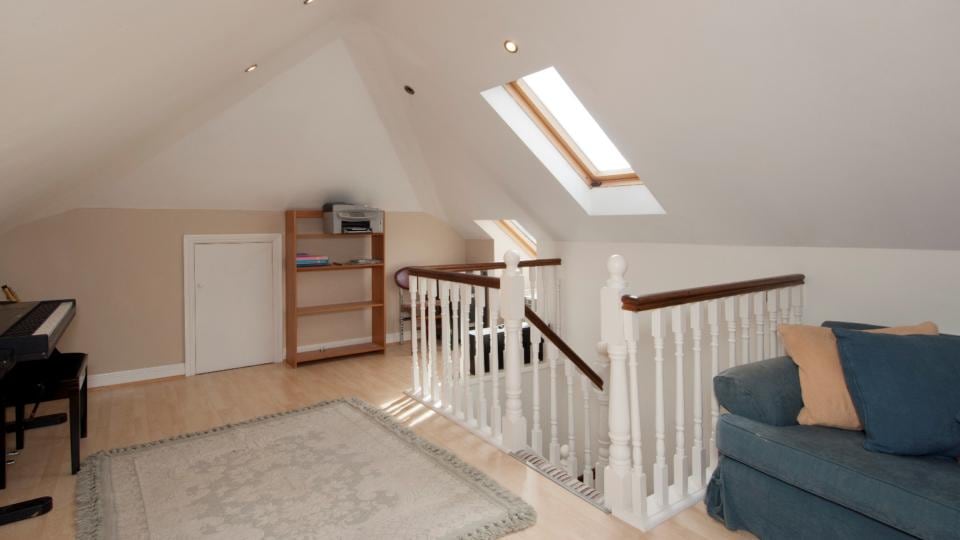 The family bathroom looks to have been recently updated with its attractive green mosaic tiling, recessed lighting and a Velux.