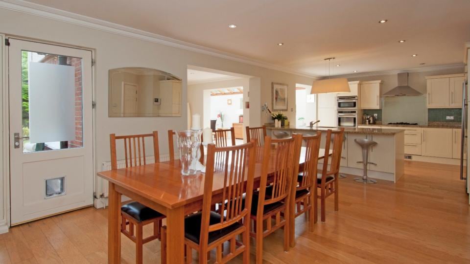 The open-plan space is a very bright, family-friendly area with room for substantial sofa, large dining table and a smart looking, recently installed, contemporary fitted kitchen with a granite-topped breakfast bar.
