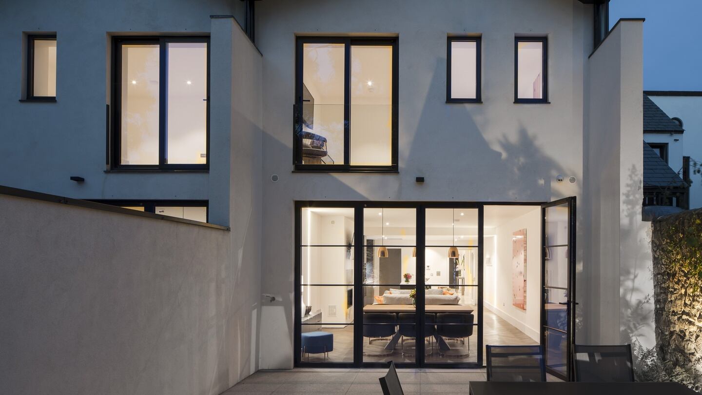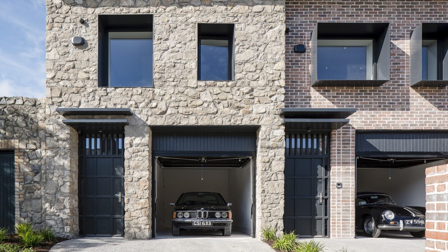 Exteriors are a mix of the original granite from the site, and brick – in numbers 2 and 3, which have cowl-framed windows adding interest to the facades. To the rear, intersecting mono-pitched roofs frame the white render, adding to the aspect from the rear garden.