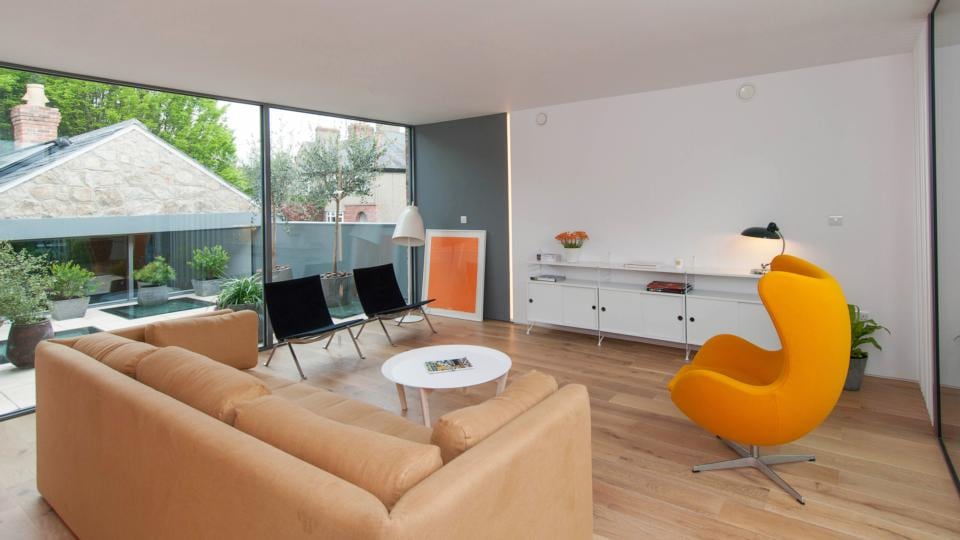 A-rated house The house has an A3 BER and is the first A-rated home PJ has built. It features no north-facing glazing, has a heat-recovery system, underfloor heating, solid concrete floors to minimise noise transfer, a solar panel on the south-facing roof of the coach house and a sedum roof. Interior Dún Laoghaire-based Lost Weekend styled the house for sale. "Our job is to go in and soften all the hard lines, adding a soft squishy sofa, and pops of colour to ping against the white and grey walls," says Declan Moloney.