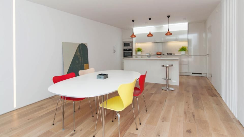 Courtyard From the front door, a set of stairs lead to the livingroom. A simple white gloss kitchen with Siletone countertops by Home Boutique Kitchens has a small utility off it. A Super Elliptical table surrounded by Series 7 chairs in Playschool colours furnishes the diningroom. From the table you look across a granite courtyard to the sitting room.