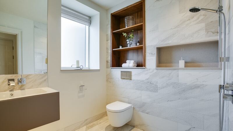 The bathrooms have Alape sinks and Duravit sanitryware, supplied by Navan-based Versatile, with textural walls and wet room areas made of bands of honed and unhoned marble tiles supplied Tilestyle. The hardware is by Dornbracht.