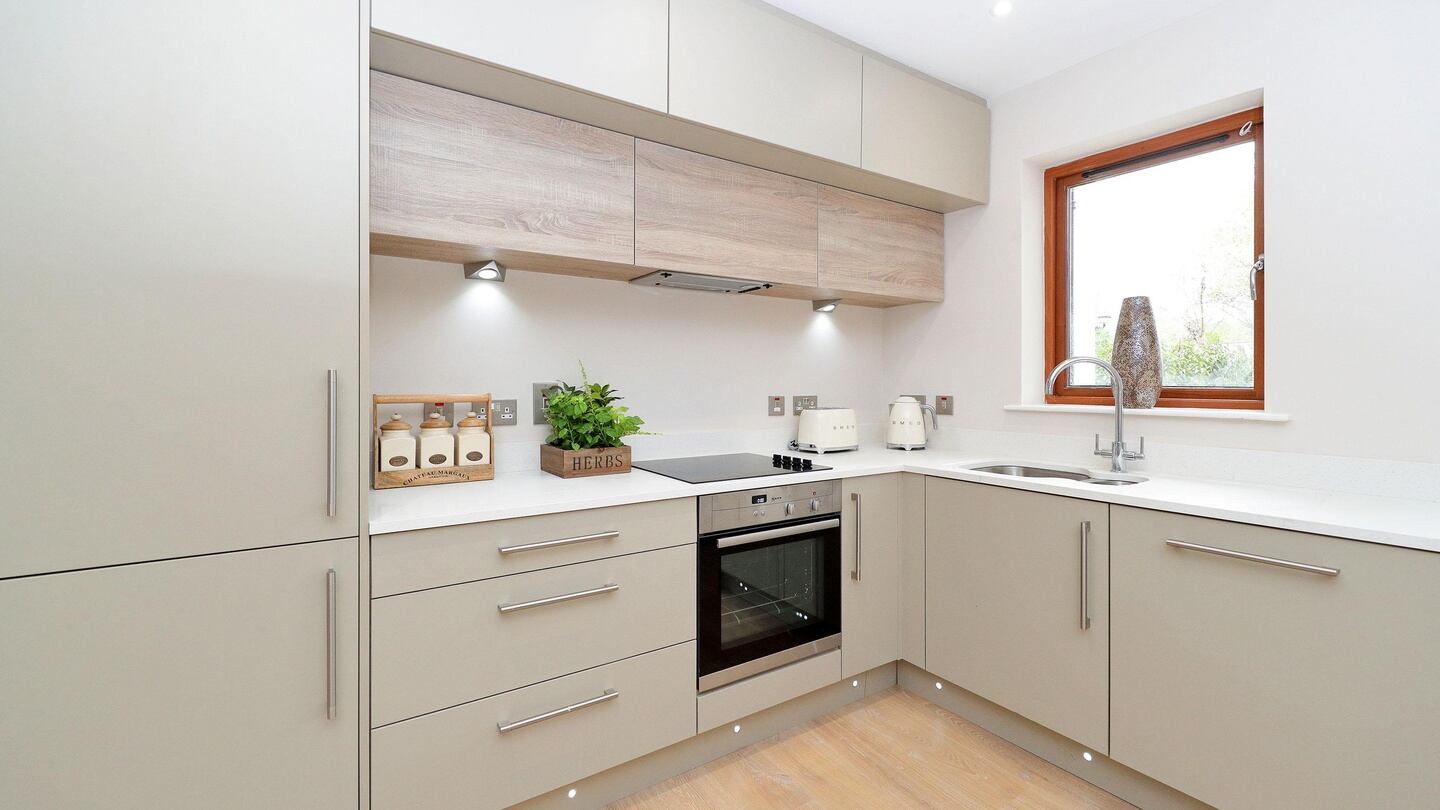 Deeply set windows throughout are a testament to the age and thickness of the original walls. One of the first-floor bedrooms has a study corner and overlooks the side of Oatlands House. The other, main bedroom has wrap-around windows over the garden and surrounding trees, an Italian-tiled ensuite and dressing room with serious space, storage and mirrors. The family bathroom is fully Italian-tiled in palest grey and has a separate bath and shower.