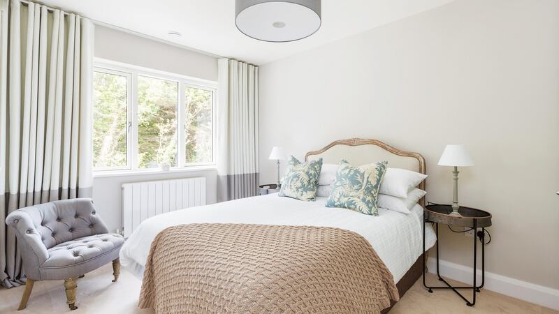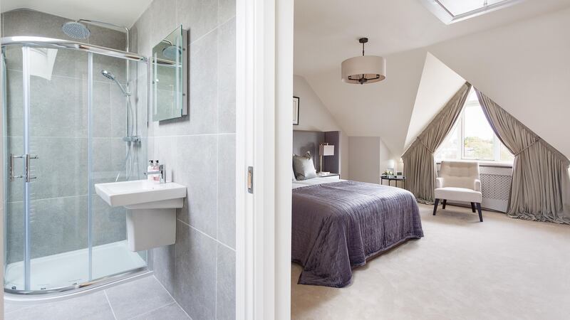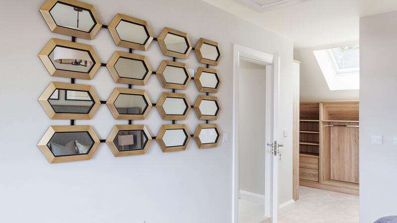 The second floor is a distinctly adult space and houses possibly the nicest room. The feature triangular-shaped window frames a view of the Luas bridge at Dundrum’s Taney Road. The front of the house faces east, making this a naturally-lit spot for a dressing table. The shower en suite bathroom is also naturally lit by a Velux window and a separate area has been hived off to fit a walk-in wardrobe, keeping the bedroom blissfully clutter free.