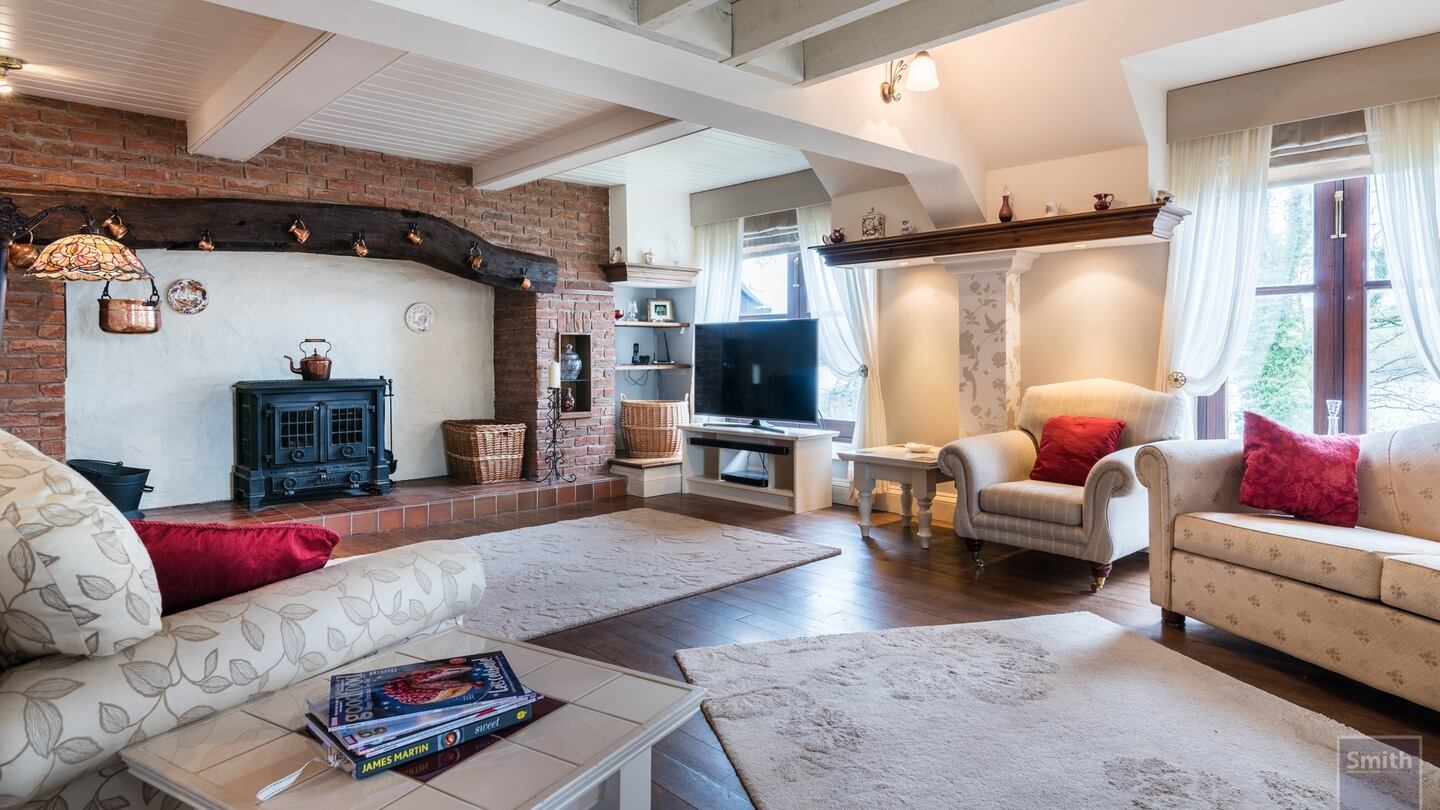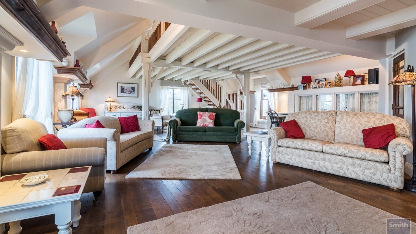 The property has an L-shaped design that maximises the lake views – there are 58 windows. Kitchens are large and well-equipped; one has a dining area big enough to fit a 12-seat dining table. Living areas are open plan with wood-burning stoves and ceiling beams; one has a minstrel-style gallery overhead, another a parquet floor. The bedrooms are cottage-like, many with deeply inset windows with seats. The pale pastel colours everywhere add to the sense of light and space.