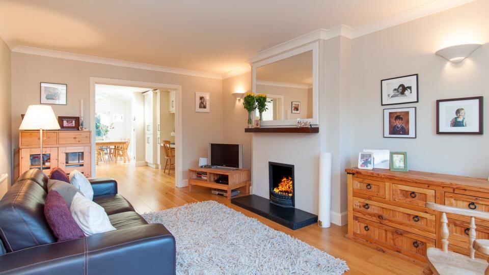 In front there’s off-street parking, and also a shared green area where, as this is a quiet cul de sac, children can play. Upstairs are the three bedrooms, one en suite, plus the family bathroom. It’s been tastefully decorated in the muted Farrow and Ball palette which seems pretty much de rigueur in Foxrock.