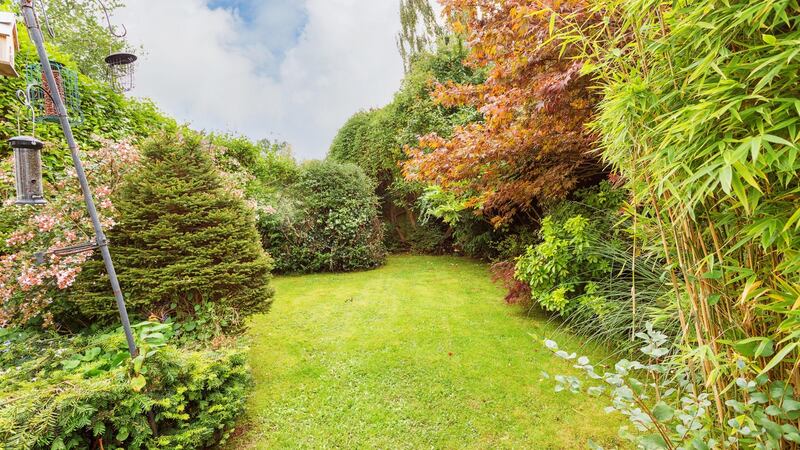 A good-sized patio leads on to a lawn sheltered by lots of mature trees and bushes.