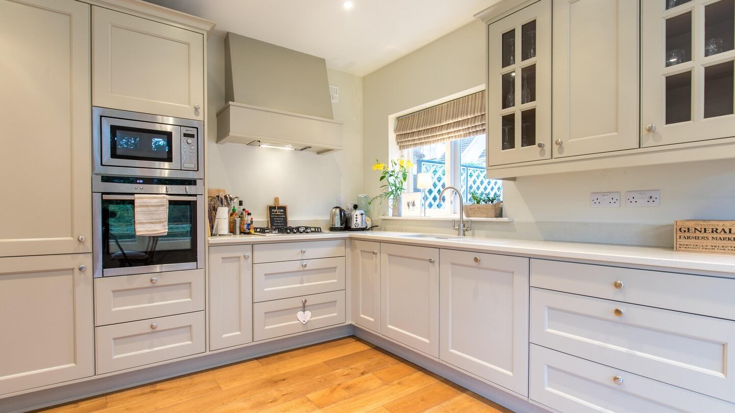The house has ample room for entertaining with smoked oak flooring knitting together the open plan ground level, which leads from a long rectangular lounge, a dual-aspect room with an inset stove, through glass panelled interconnecting doors to the kitchen. This room takes in light on three sides and features a tasteful grey coloured, in-frame kitchen. Hidden from view is a guest toilet, utility area and larder cupboard that someone trading down might have become used to in a far bigger-sized property.