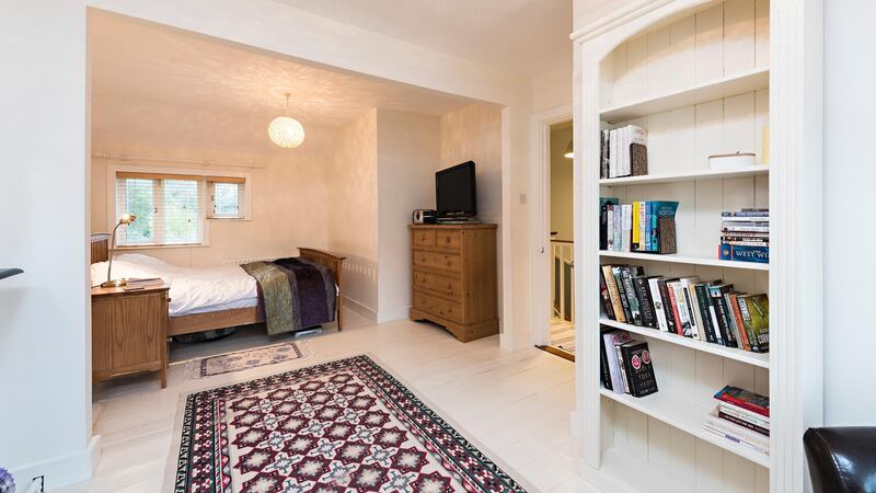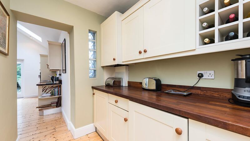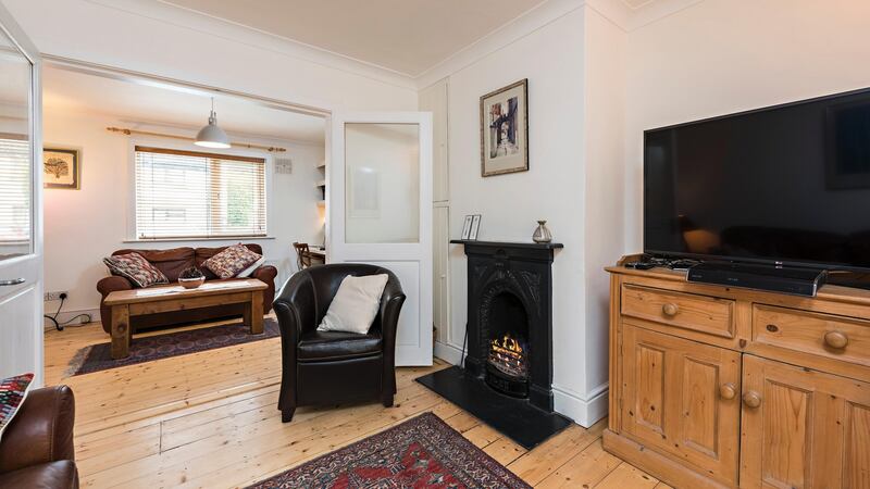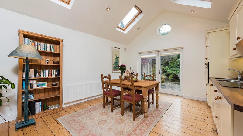 The E1 Ber-rated house has salvaged pitch pine floorboards throughout the ground floor which comprises a small sitting room to the front with an open fireplace, a lounge to its rear that can be accessed by glass paneled interconnecting doors, also with an open fireplace, and a large kitchen-dining room with roof lights and a round window on the gable end that floods light through.