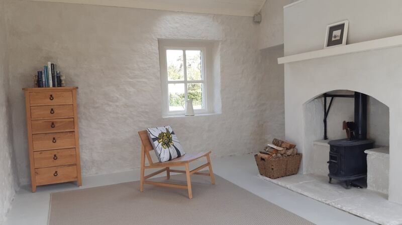 The property extends to about 45sq m (484sq ft) and is set out as two rooms with vaulted, tongue-and-groove panelled ceilings and rough, lime-rendered walls, opening into the room with fireplace (pictured).