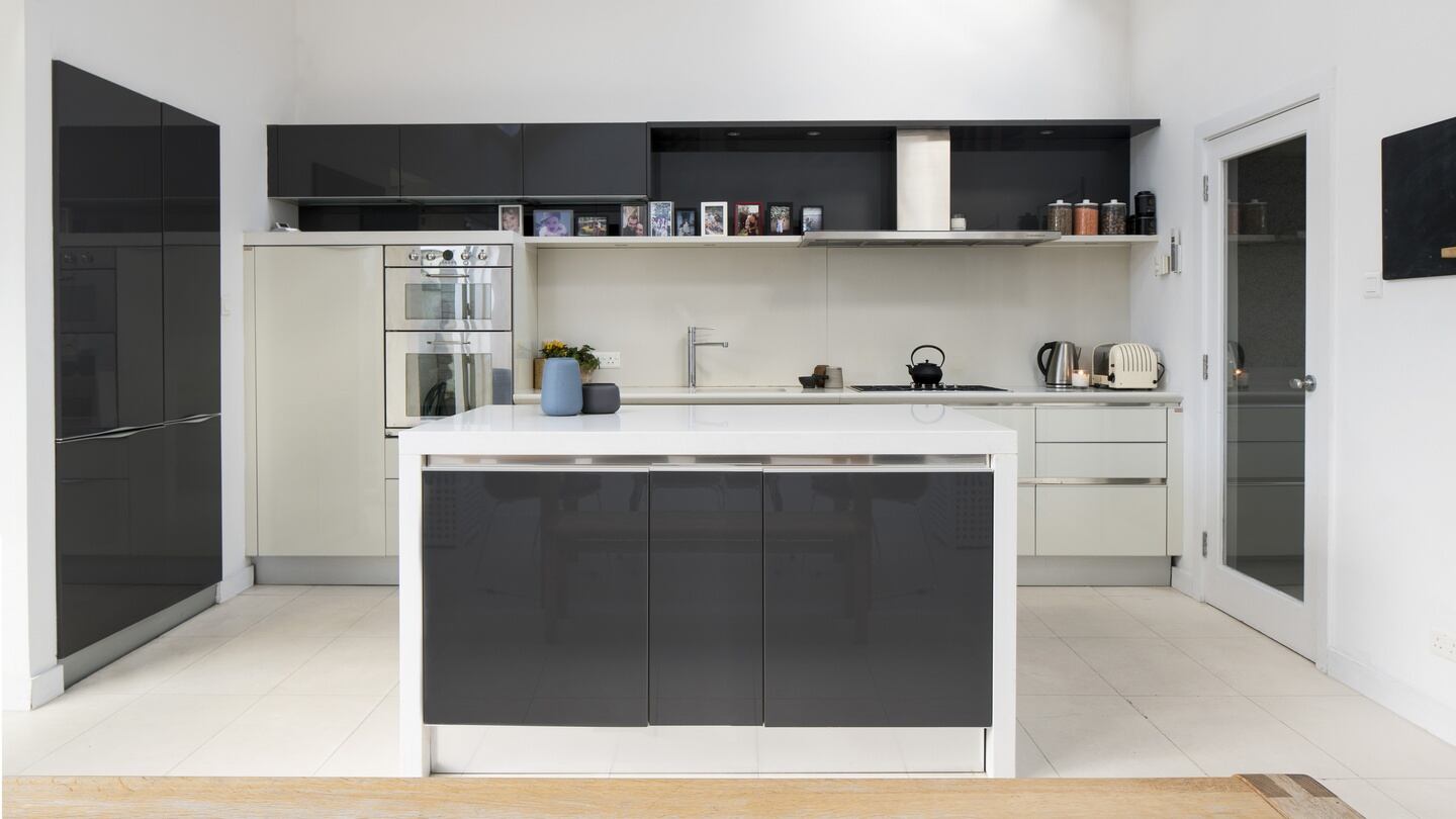 The ceiling in the kitchen was raised to roof level and dotted with six Velux windows to get natural light from two sides – the house has a southwest orientation. This is a bright modern room with sleek grey gloss units on one wall – the kitchen is by Italian firm Snaidero – with a good-sized island unit and room for a large dining table.
