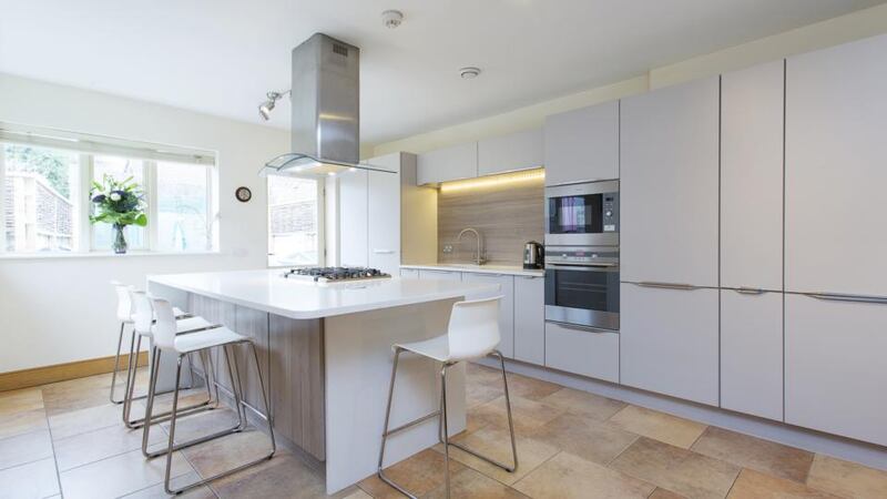 Despite the extension, it remains spacious outside, and it’s a secluded sun trap in summer. The kitchen is by Kube and has a large island unit, which doubles up as a breakfast bar and cooking area with its integrated five-burner gas hob.
