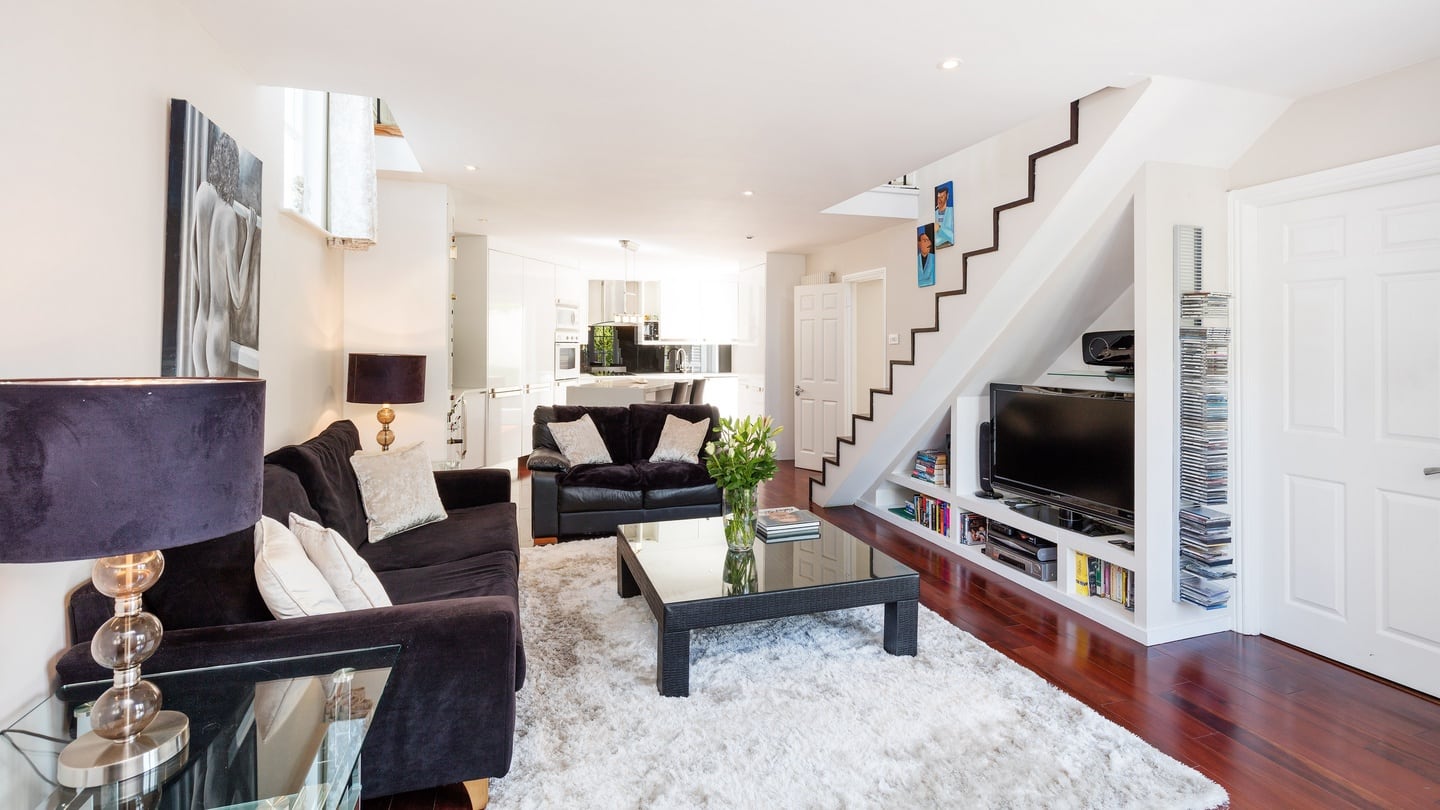 A door beside the cooker reveals a very cleverly hidden utility room. Solid walnut flooring throughout the ground floor gives a uniform feel, and an open-sided staircase to the master suite and French windows to the front lighten the entire space.