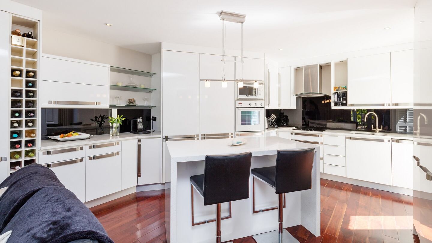 A clean white colour palette and the strategic use of large mirrors also help maximise natural light.