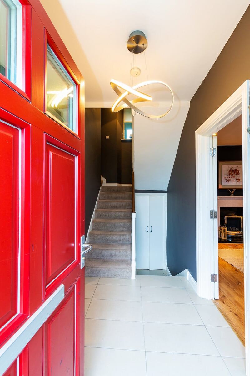The entrance hall leads to a living room on the right, where the gas-fired insert is book-ended by two floor-to-ceiling glass panels that look into the family room to the rear.