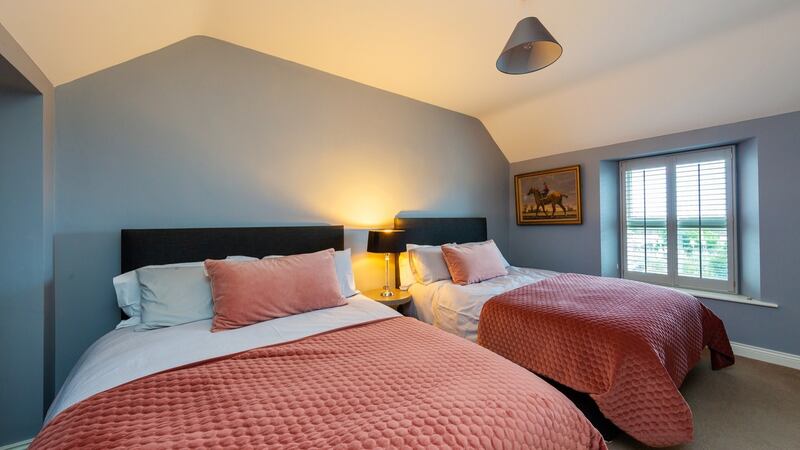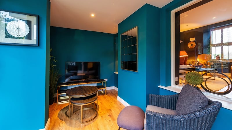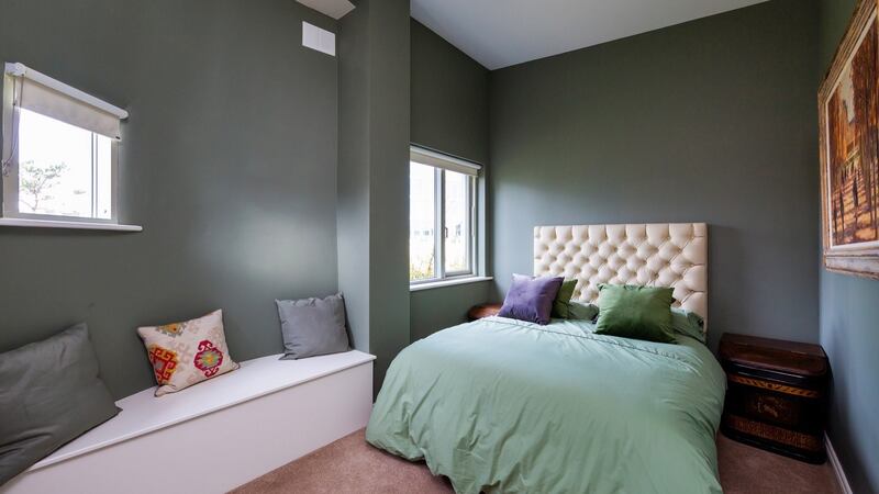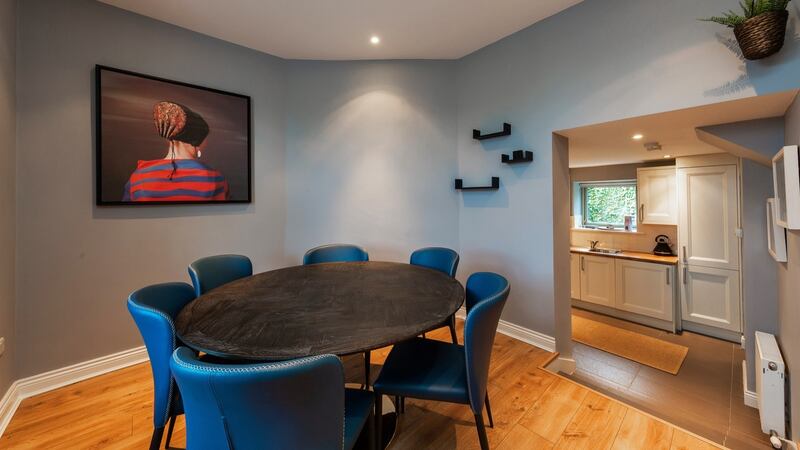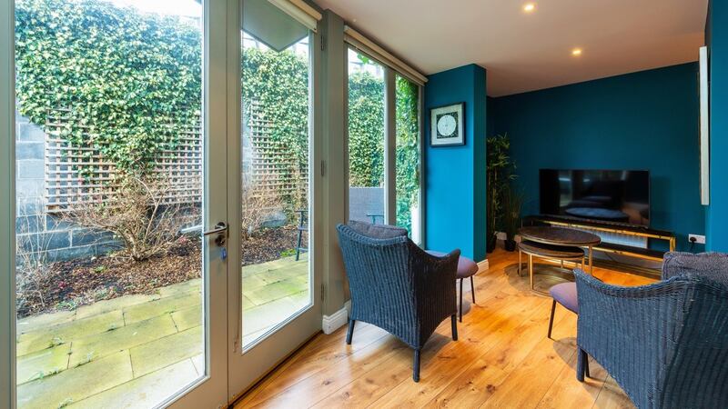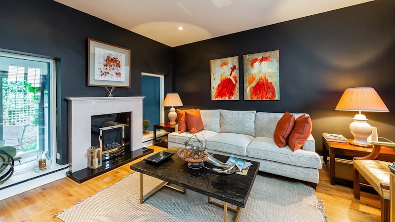 On the other side of the hall is its breakfast room, with the relatively small kitchen set at a level below and the family room, painted an on-trend classic blue, a few steps below that again. All the rooms have rich coloured shades on their walls that help to create a cocooning effect, further enhanced by the plantation-style shutters on all windows to the front. The impressive double glazing by Rationale really dials down the constant hum of traffic on the busy Merrion Road.