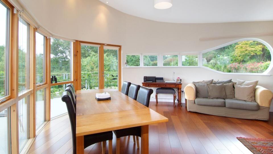 The couple added an architecturally designed extension to the front, to create a modern kitchen and dining area, bringing the floor area to 172sq m (1,851sq ft). The curved front maximises views to the landscaped gardens and beyond to the city skyline through picture windows.