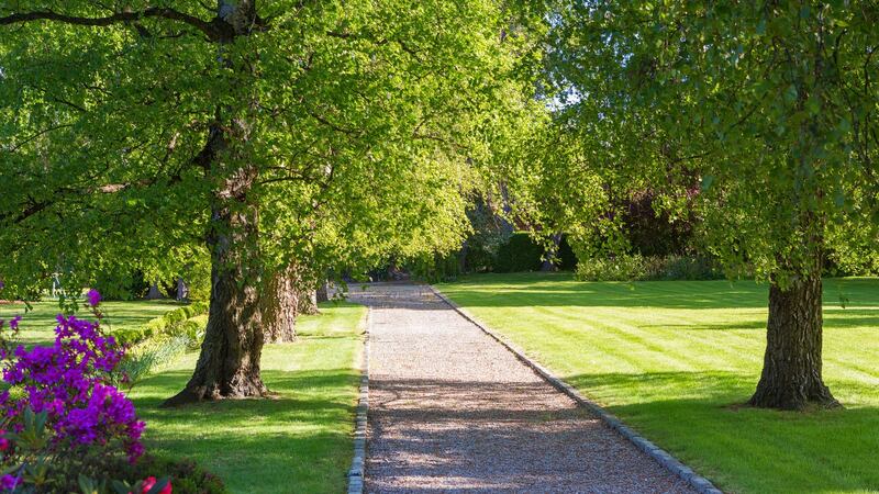 Outside, an iron gate leads past an octagonal gardener’s house to a long tree-lined path dividing two long lawns; there is access to a laneway at the rear right side of the garden. Trees in the garden, front and back, include cherry and lilac, a Monterey Cypress as well as sycamore, birch, beech and pine. Very tall trees shield the front garden, and the sweeping gravelled driveway, from Kerrymount Avenue