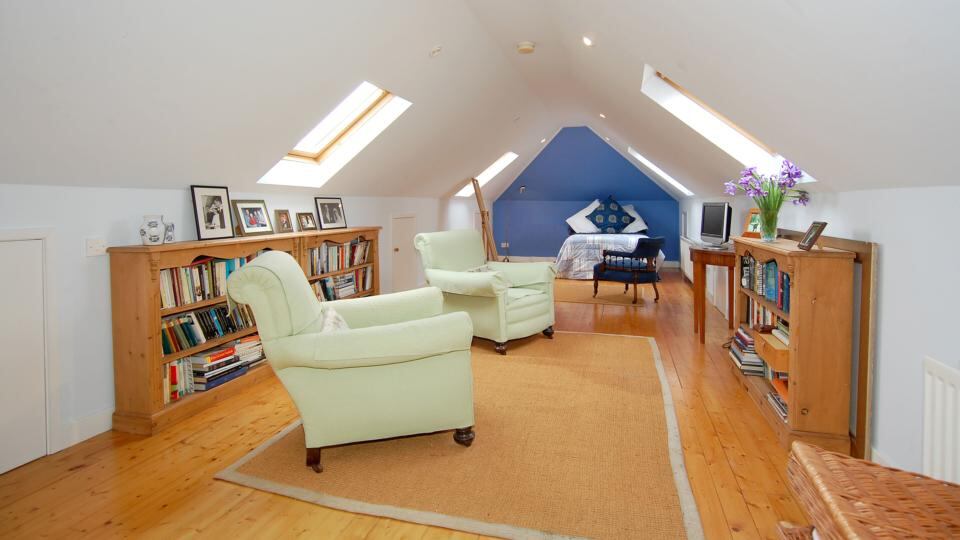 Upstairs are two double bedrooms, a family bathroom with freestanding claw-footed bath and the surprise of the house: a colossal room which is used as a fourth bedroom.