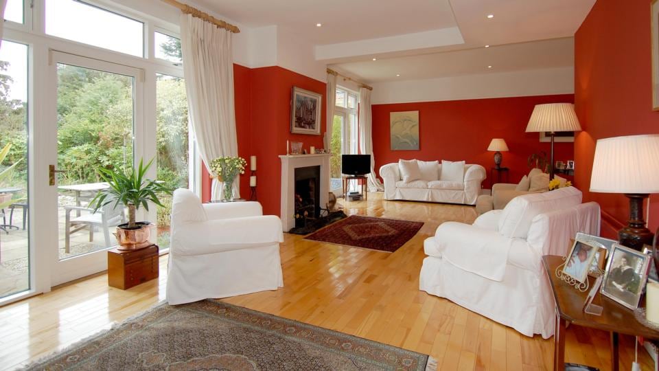 Rust-hued red paint beautifully contrasts with the white picture rails and polished maple flooring, which runs throughout the house. The room has a period feel and features a white limestone fireplace and the family’s grand piano stands proudly in front of a large bay window overlooking the front garden.