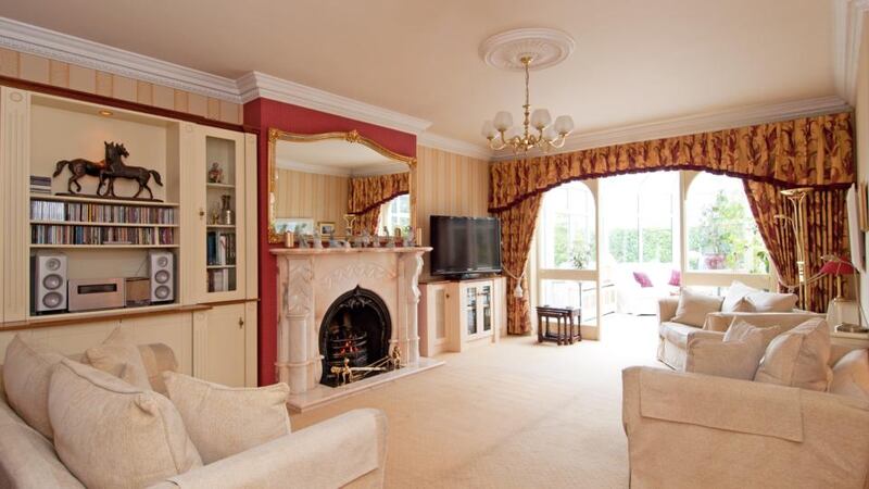 We’re sitting in the large sitting room of this five-bedroom- ed family home, after a tour of the house which has taken in the imposing double height hallway, with stained glass windows, and a marble fireplace fitted with an electric stove.