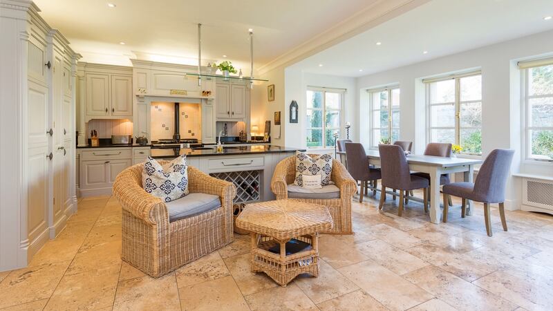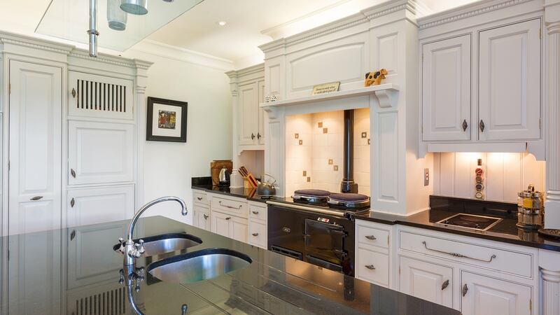 The kitchen is fitted with a traditional-style painted timber model from Design House Dalkey. It has a large, stone-topped island unit and a glossy black Aga and while it is nearly 20 years old, its design and quality has stood the test of time, something that can’t always be said of fitted kitchens.