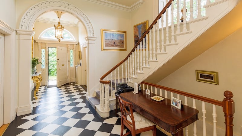 Inside the imposing exterior lies an exceptionally large hallway with what can only be described as a Scarlet O’Hara staircase, overlooked by a magnificent arched window and also by a painting of Alfred Henshaw, the man who built this and three other houses on the road for his family.