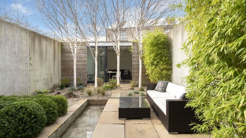 The garden, which separates the main house and studio, has a similar theme of cool functional modernism – and is laid out around a water feature flanked by bamboo and towering silver birch.