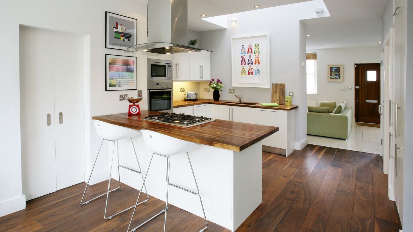 A modern kitchen with off-white high gloss units, Neff appliances and walnut countertops that echo the wide plank walnut flooring.