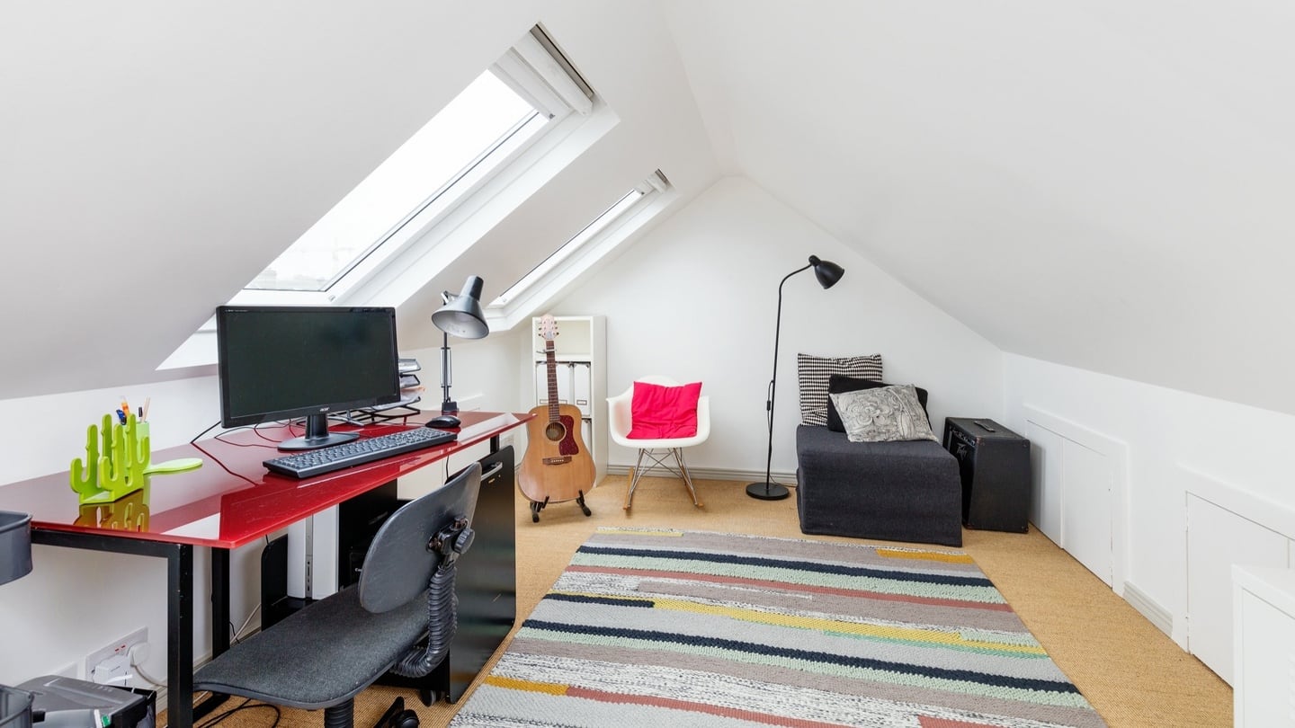 Far removed from the rest of the house and with a view of the Spire and across the rooftops to the south of the city, the attic is the perfect place to set up a home office and has been used by the owners for multiple purposes.