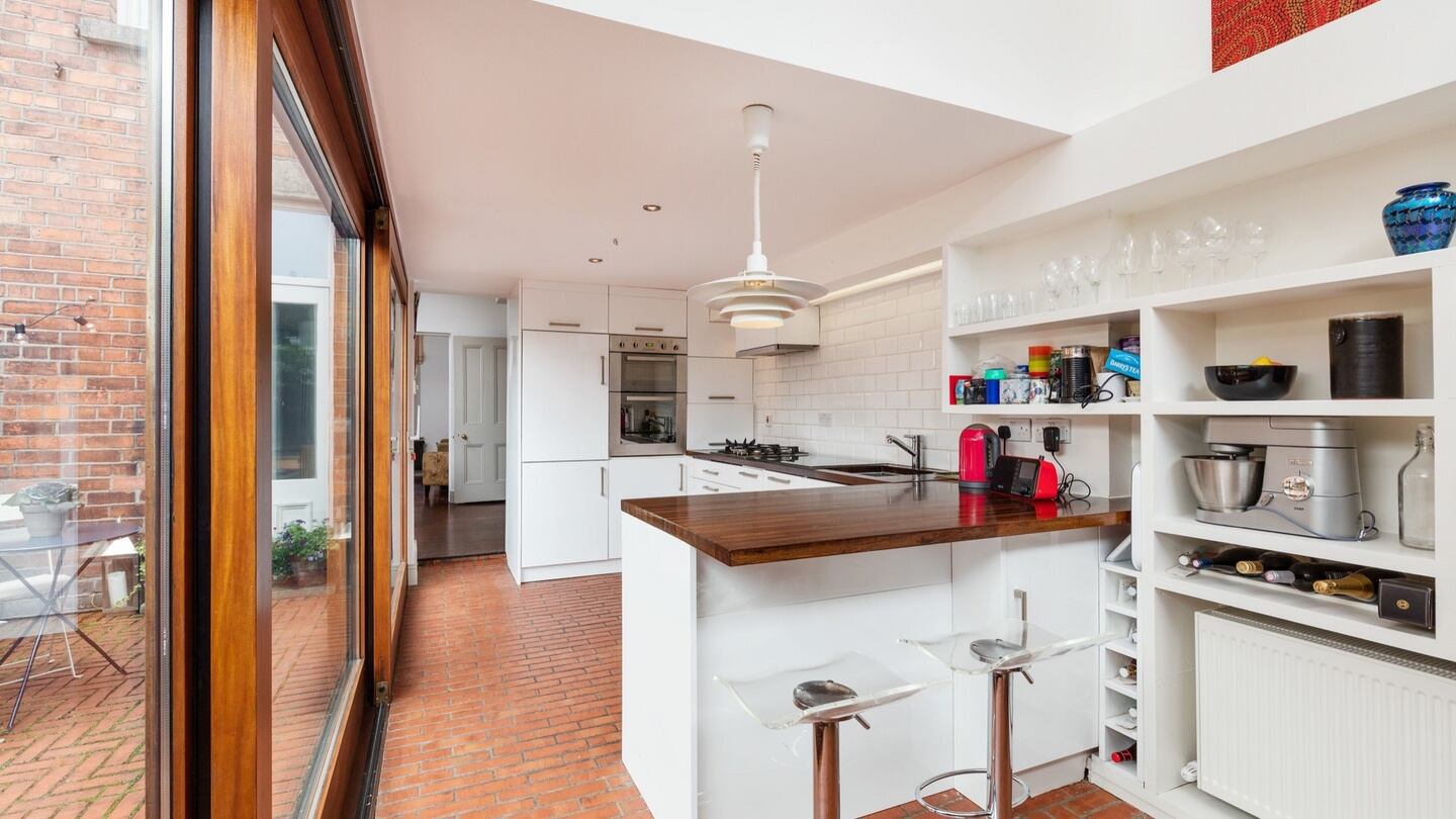 Upstairs, the bedroom on the return has been converted to a sleek bathroom. In many of the neighbouring houses the bathroom can be found to the rear of the kitchen, downstairs, not always convenient in the middle of the night. Set out in mosaic tiles with plenty of natural light, this bathroom has enough space for a free-standing tub and separate shower.