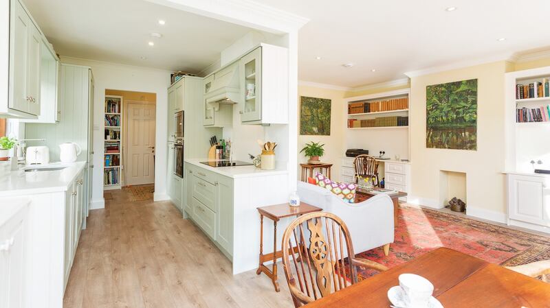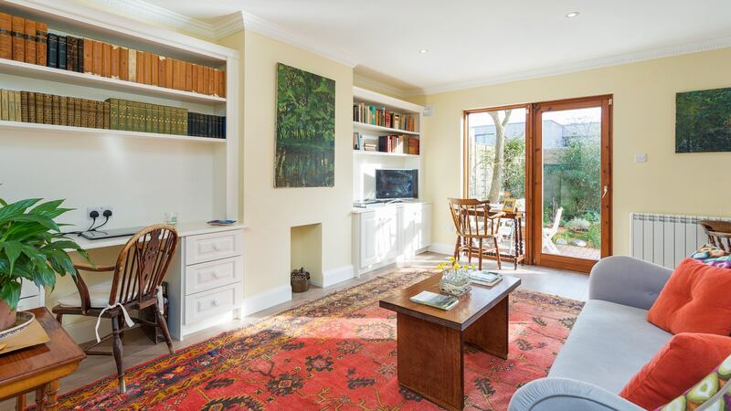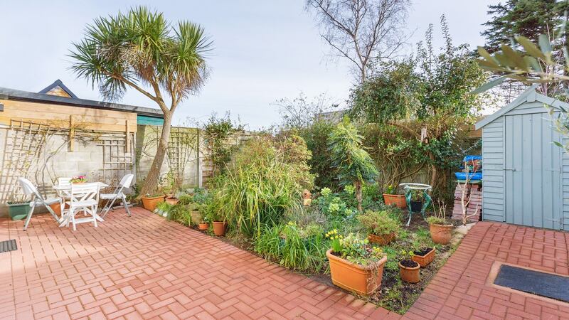 The sitting room is a decent size and has built-in bookshelves and presses on both sides of a small open fireplace. A double-glazed hardwood door opens on to a 28ft-long secluded rear garden: it has a cobble-lock patio, garden shed and a nice space currently filled with lots of potted plants.