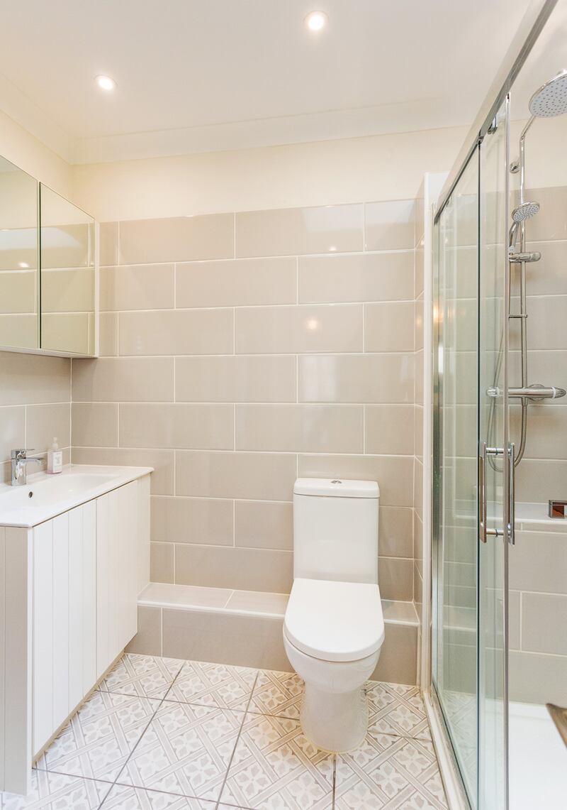 The two bedrooms are doubles, both with built-in mirror-fronted wardrobes. The larger main bedroom has a box bay window overlooking the green space at the centre of Village Gate, and a window seat with built-in storage beneath it. The smart bathroom at the end of the hall is mostly tiled and has a large step-in shower.