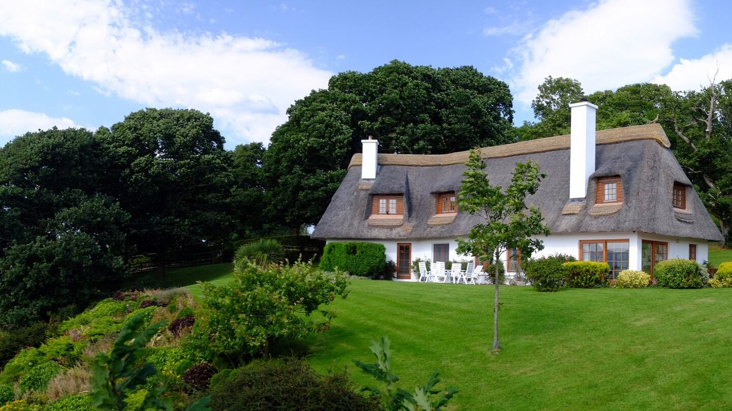 From the outside, the house is charmingly whitewashed, with timber framed windows, a rich thatched roof, and windows peeping out of the eaves.
