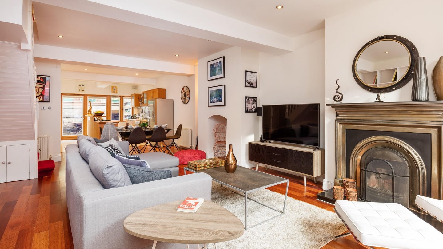 The main, first-floor bedroom (once two bedrooms) runs the length of the house and has a front window, high ceiling and fitted wardrobes. A second bedroom faces the front and a third is to the rear.