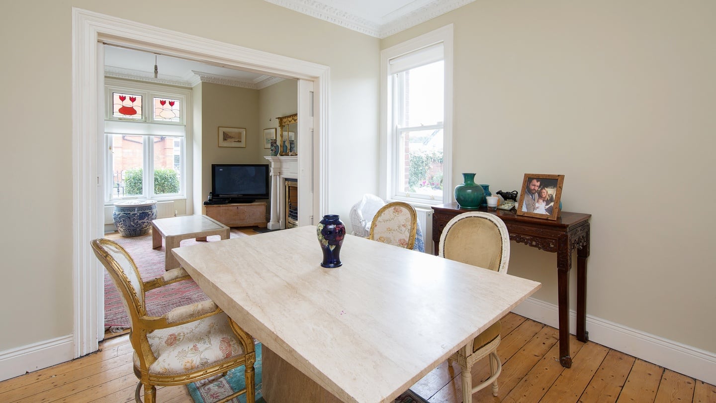 Pretty original features such as the stained glass in the front door and bay window were kept and floorboards were sanded and polished. As it’s on the end of a terrace, it is brighter than expected with windows in the gable wall giving extra light into the rear reception room and bathroom.