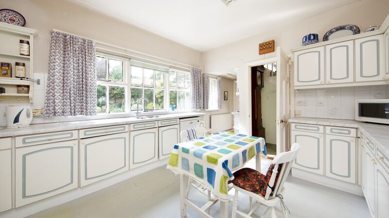 The kitchen is very 1960s, with white units; there’s a large utility room off it, next to a blocked-up garage, now used for storage. Upstairs there are four bedrooms, three doubles and a single off the landing as well as the family bathroom and a separate shower room.