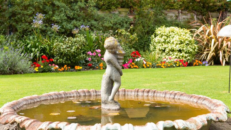 The garden has been extremely well-maintained: a smooth green lawn is bordered by a rich array of flowers, with very tall, very mature trees that include sycamore, pine and oak sheltering the property, particularly at the front. It has an unusual but pretty semi-circular patch of ground ivy at the edge of the lawn.